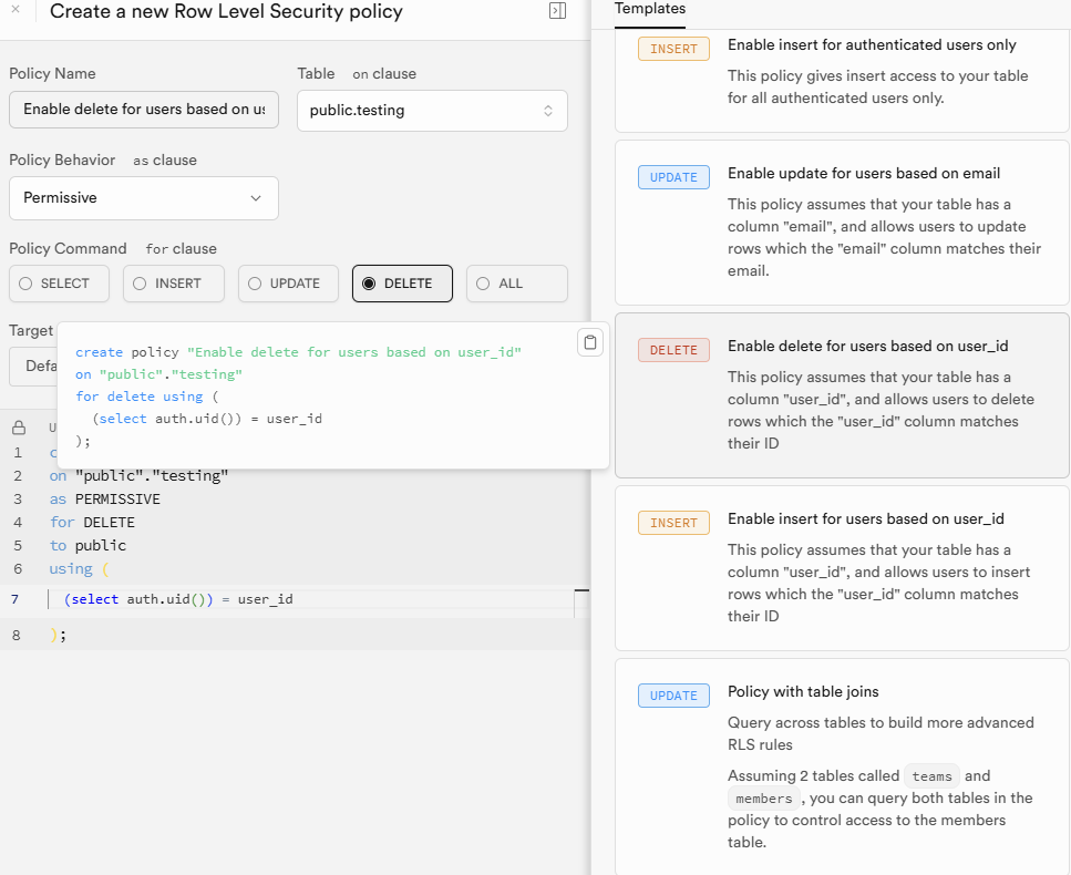 예를 들어, 자신이 등록한 행만 지울 수 있게 허용을 하려면 지금 선택되어있는 정책을 적용하면 되겠죠.