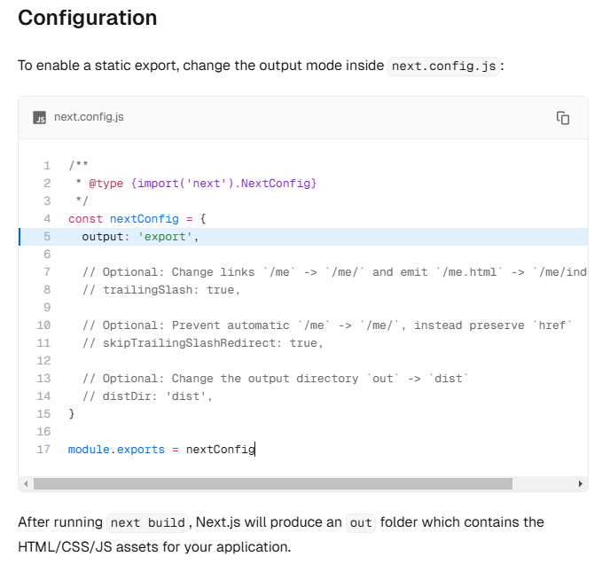 예전에는 next export 라는 명령어로 따로 정적 파일을 만들었었는데, 이제는 next.config.js에서 설정해주면